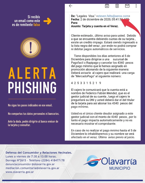 En el marco de un incremento de fraudes telefónicos y virtuales, desde la Dirección de Defensa al Consumidor y Relaciones Vecinales emitieron un alerta por una nueva estafa en Olavarría. Según señalaron desde el organismo municipal, en esta modalidad la víctima recibe un supuesto mail del banco informándole que debe cuotas de la tarjeta de debido por un crédito impago y que, por esa razón, está a punto de ser ingresado “a la lista negra del Veraz”, lo que haría que desde ese momento ya no pueda “comprar ni debitar pagos automáticos de servicios”.
